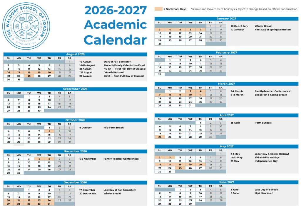 Keep tabs the yearly rhythm at the Waldorf School of Jordan. Used primarily by currently enrolled and prospective families, our School-Year Calendars give an overview of school breaks, vacations, holidays, and other important dates.
