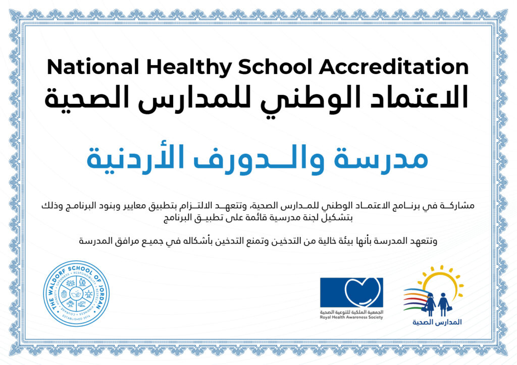 At the Waldorf School of Jordan, we are proud to announce a milestone achievement that reflects our unwavering commitment to the health and safety of our students, staff, and community. Our school has been awarded the Silver Level Accreditation in the Healthy Schools Program, a prestigious initiative by the Royal Health Awareness Society (RHAS). This recognition not only honors our ongoing efforts but also symbolizes the seriousness with which we uphold health, safety, and well-being as core values of our school.